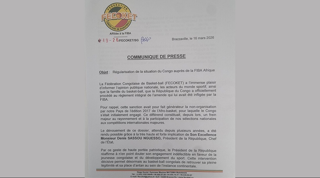 Dans un communiqué de presse signé le 16 mars 2026 par le Président de la Fédération Congolaise de Basket-ball (FECOKET), Fabrice Makaya Mateve, il a été souligné que la République du Congo a payé int...