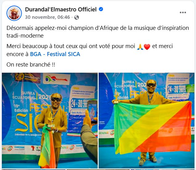 Créateur du style tradi-pop, il a exprimé sa joie sur sa page Facebook le 30 novembre 2025 à 6h46, en déclarant : « Désormais appelez-moi champion d’Afrique de la musique d’inspiration tradi-moderne. »